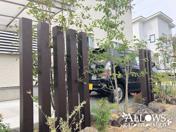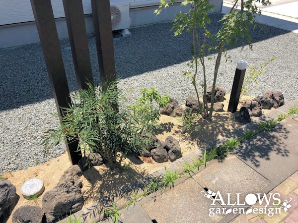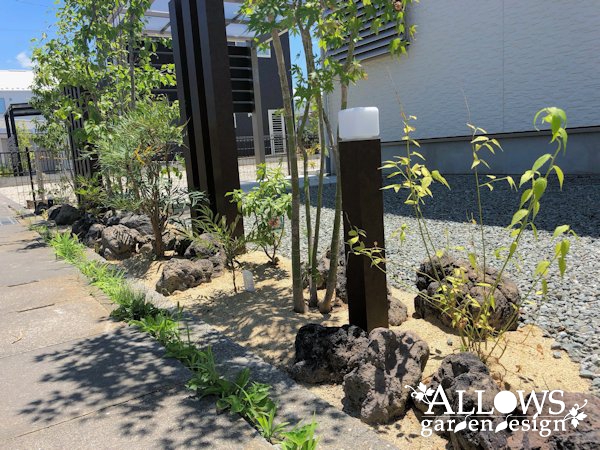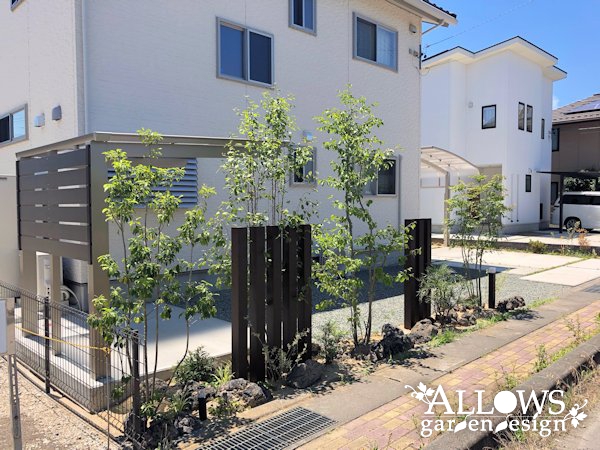 一期工事で南面のお庭を施工させて頂き、今回は道路面の植栽スペースとサイクルポートのご依頼をいただきました。道路沿いということで、アクセントにスリットフェンスを採り入れ、植栽と浅間石の異素材と組み合わせておしゃれに仕上げました。更には照明もご採用いただいたので、夜には幻想的な雰囲気になっています。