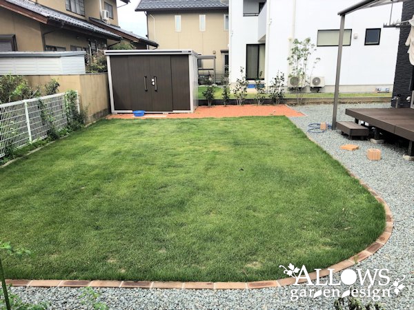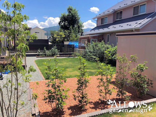 植栽は左から、ソヨゴ、アズキナシ、アオハダ、ヤマモミジ。 低木はマホニアコンフーサ、シルバープリペット、ヤマブキ。弊社で植えた後に、お施主様自ら数本を追加して植えていただきました! 緑の良さをご理解いただけるのは、とっても嬉しいことです。更に素晴らしいスペースにしていただき、ありがとうございます!