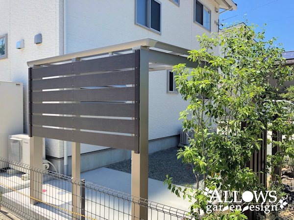 サイクルポートは、三協アルミの『セルフィ ミニ』背面には樹脂フェンスを取り付け、視線と雨の吹き込みをガードしてくれます。
