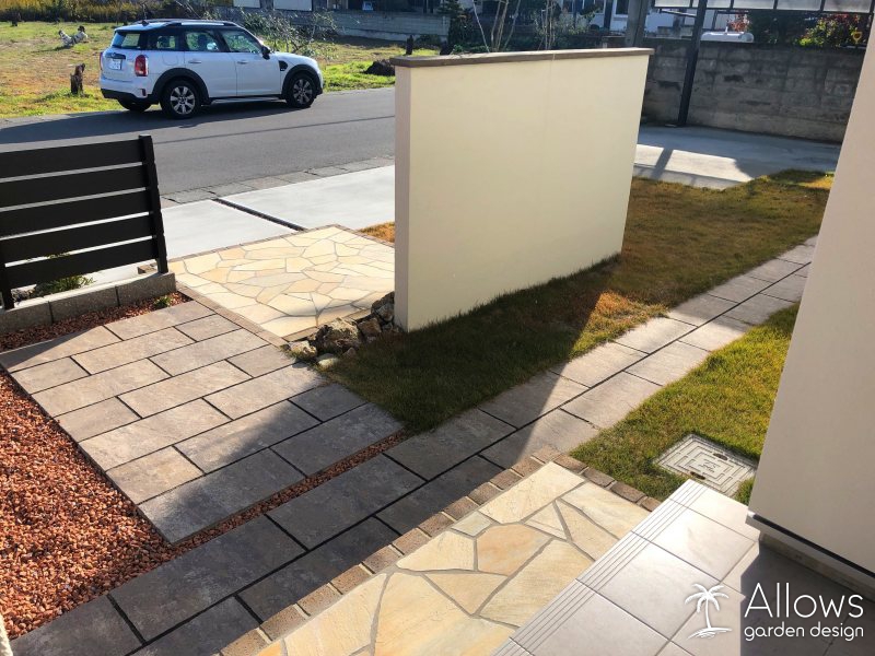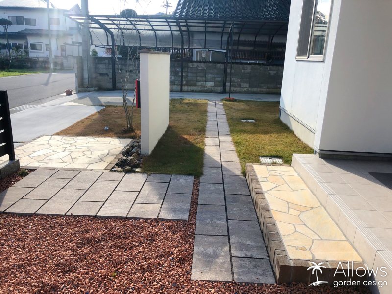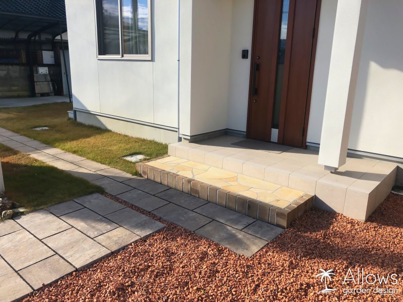 レンガと石張りの階段をあがるとインターロッキングのアプローチに続きます。