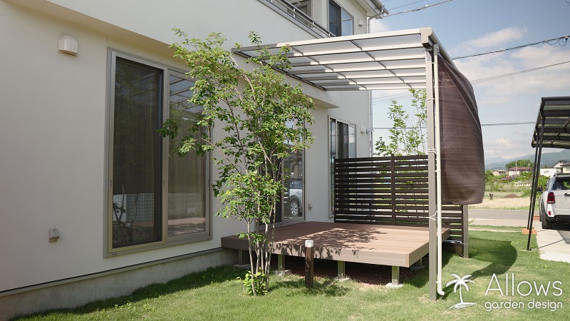 春には、デッキ横に植栽したジューンベリーとナナカマドが青々と葉をつけ、木陰も作ってくれます