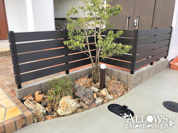 フェンスをクランクさせて空けたスペースには自然石を敷き詰め、常緑樹のソヨゴとマホニアコンフーサを植栽。