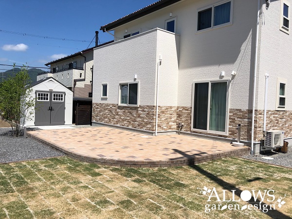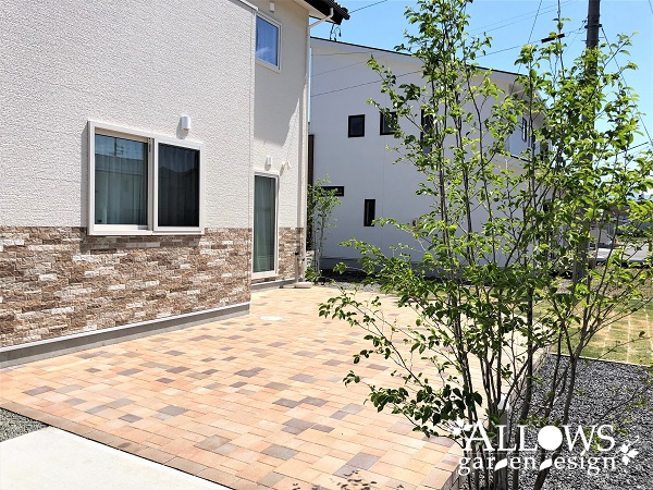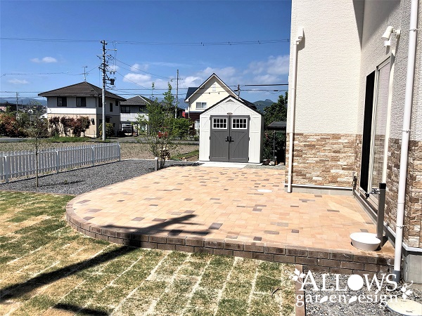広々としたインターロッキングのテラスが広がります。