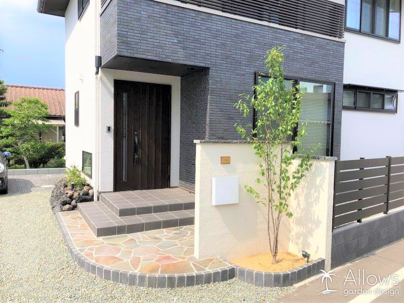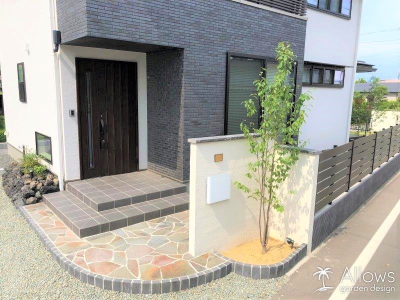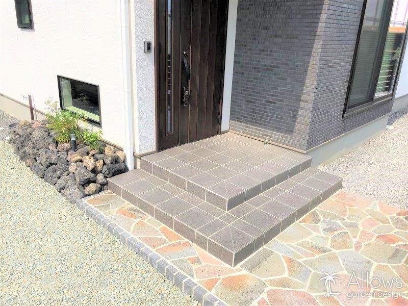 アプローチはグレーのレンガを立ち上げ階段状にして、天面は佐久鉄平石の乱張りです。