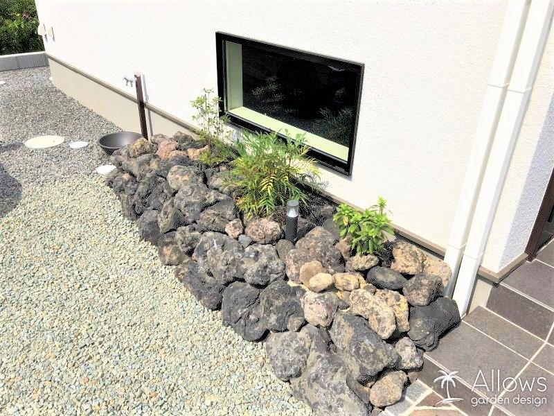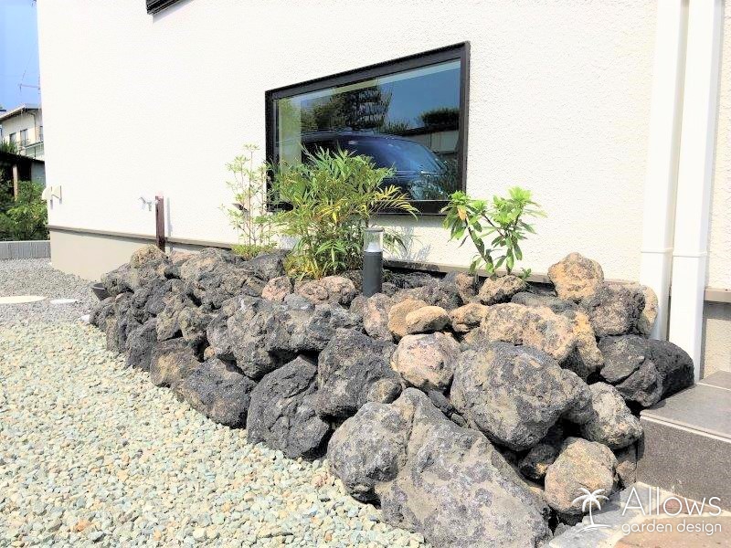 この浅間石の花壇は、モルタル固定をせず土決めで仕上げています。