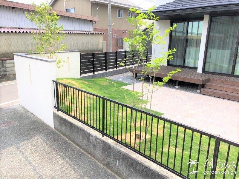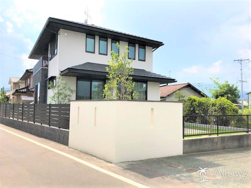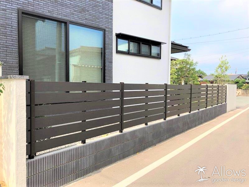 道路側にはデザイン性の高い樹脂フェンス、境界側はアルミフェンスを施工しました。