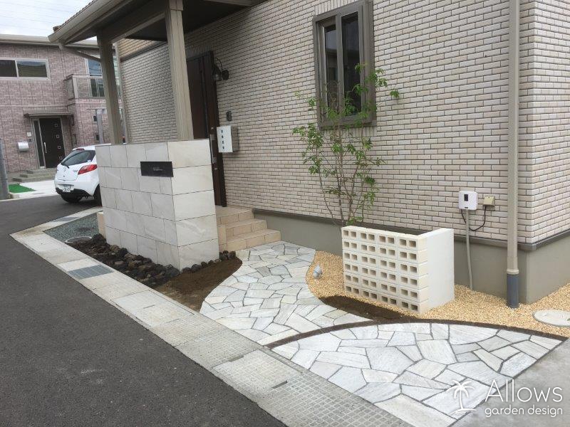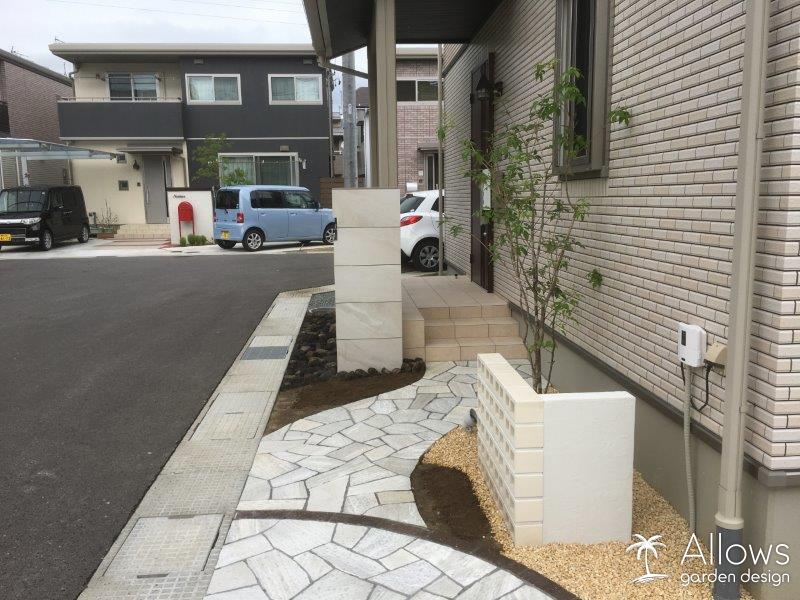 アプローチには、天然石の乱張りを使用しさらに高級感をアップ。