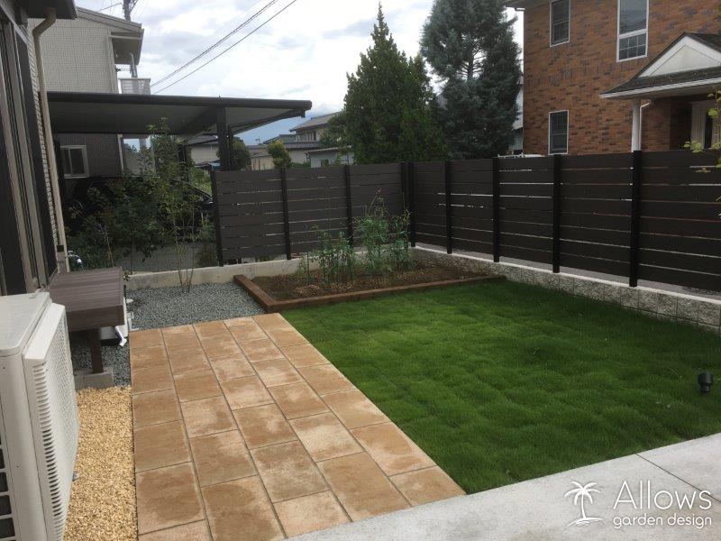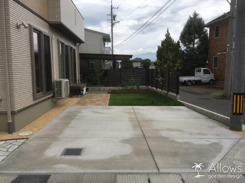 駐車スペースの奥には、天然芝とインターロッキングのガーデン。