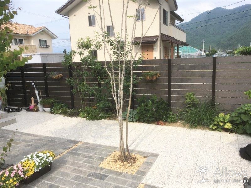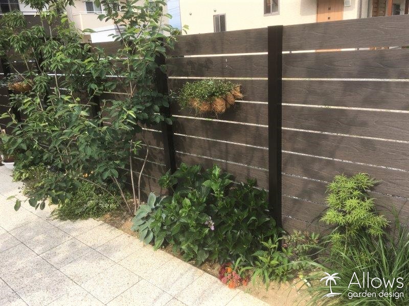 フェンスだけだと少し殺風景な印象でしたが、お客様がご自身で様々な植栽を植えてくだり、華やかな空間になりました!