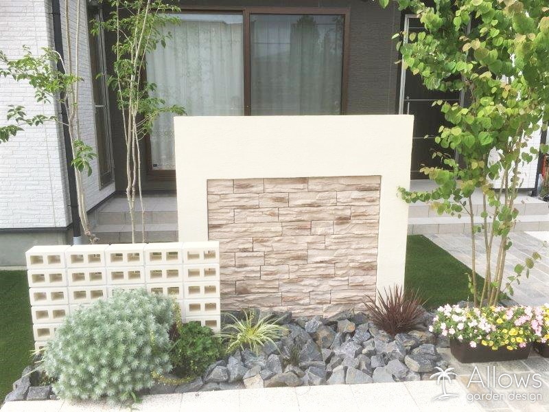 2つ目の門袖は、塗りと石調のタイルを組み合わせた門袖と、有孔レンガウォールのダブル門袖。