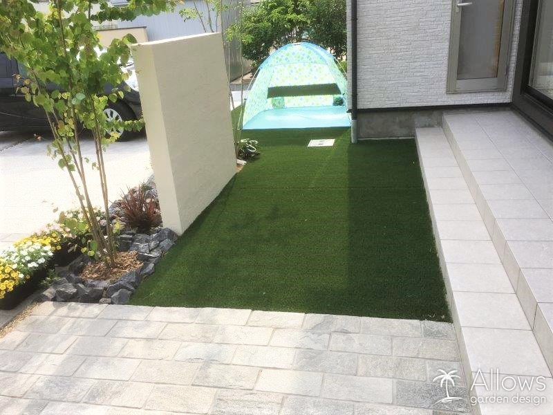 裏側は人工芝を敷いたローメンテナンスガーデンになっており、夏場はテントやお子様のプールを出して楽しんで頂けているようです。