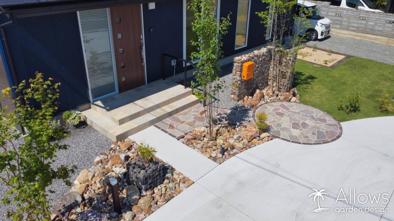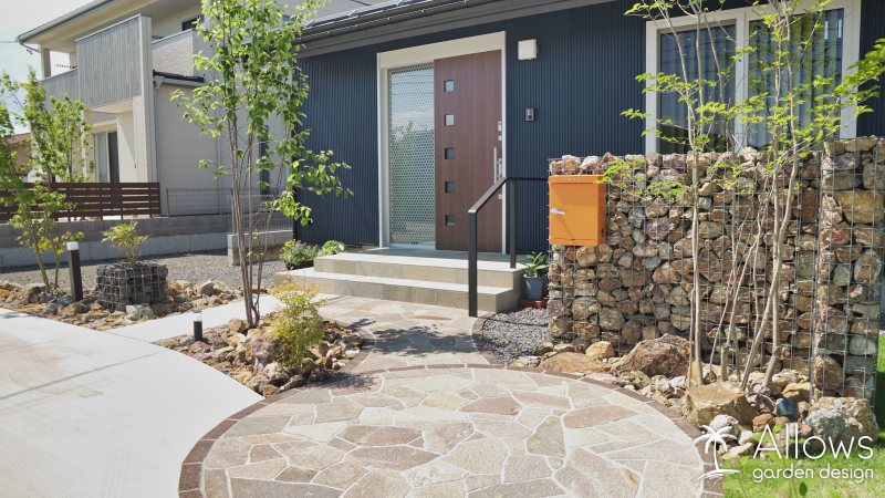 天然石のアプローチや石積みのウォールで、優しさも演出しています。