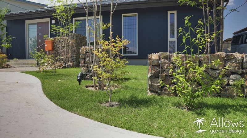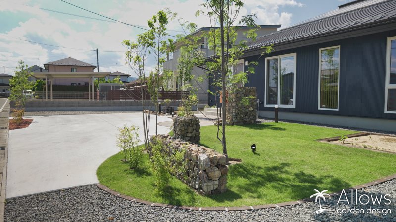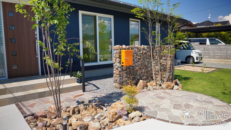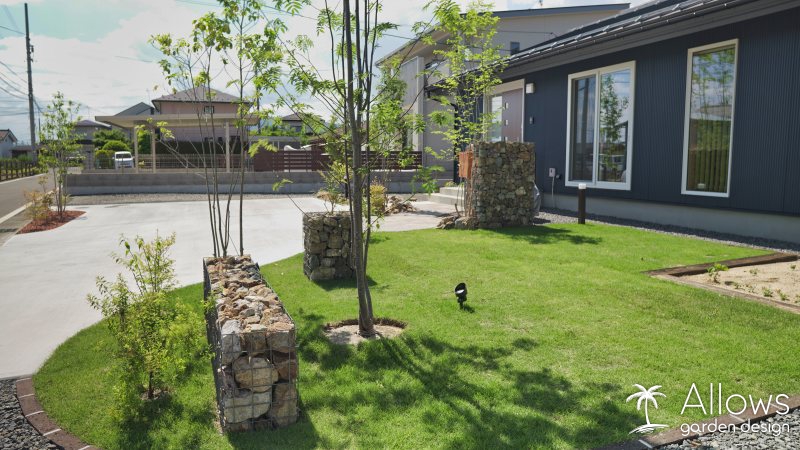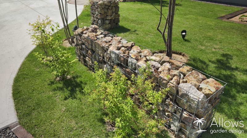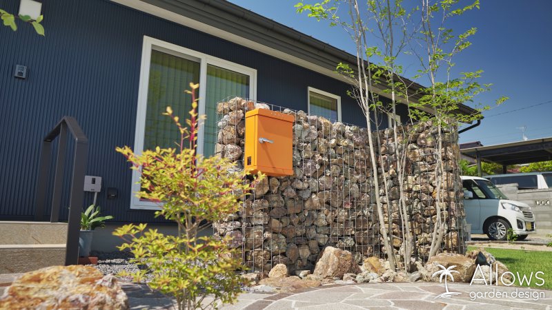 所々に配置した石積みのウォールは、”ガビオン”という商品です。
