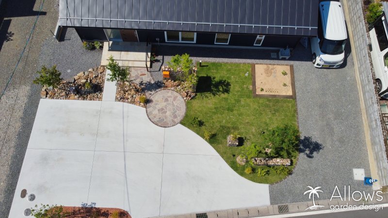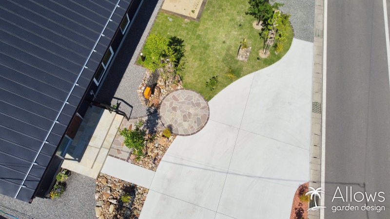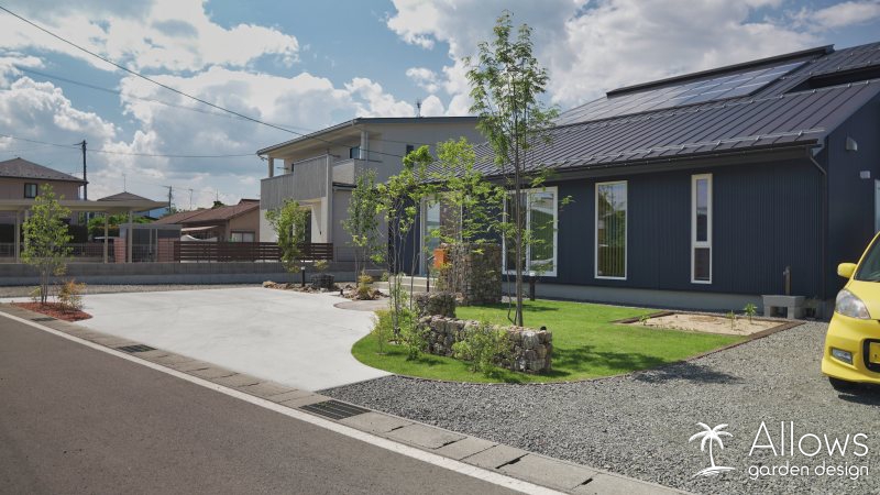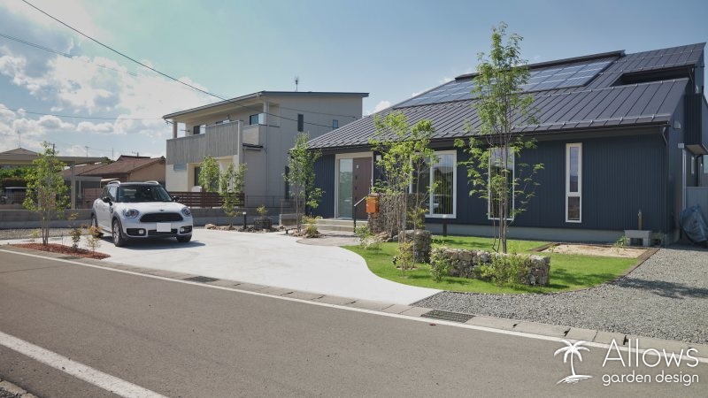 駐車場コンクリートの白と、芝生や木々の緑のコントラストが美しいですね!