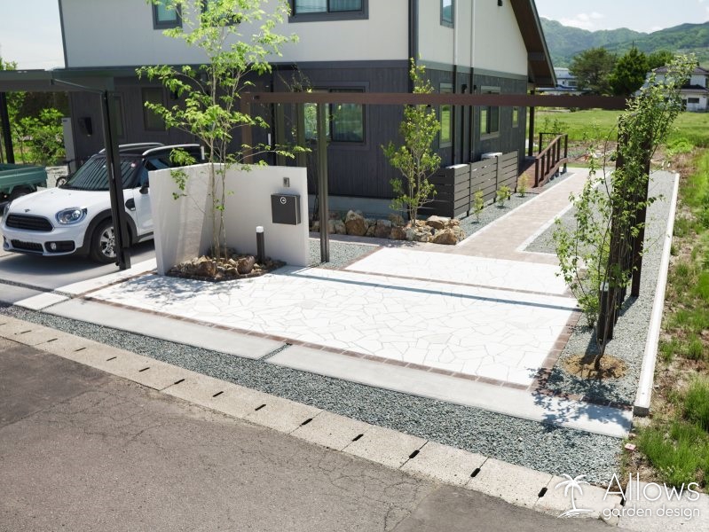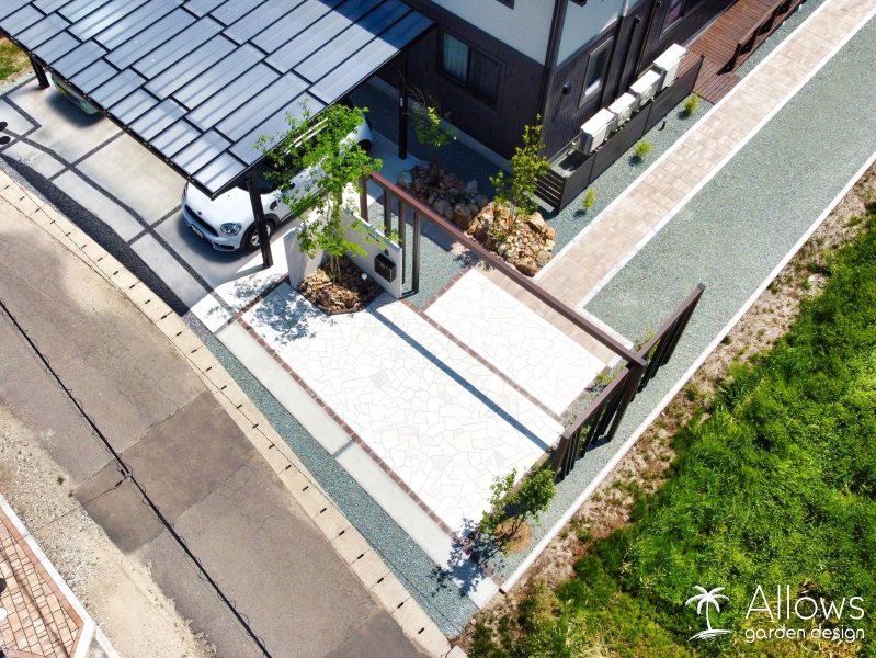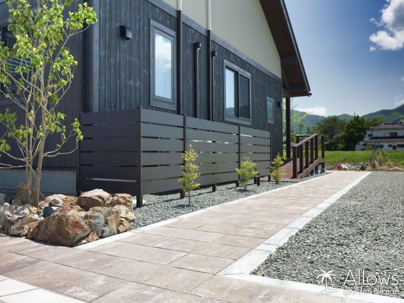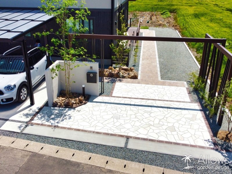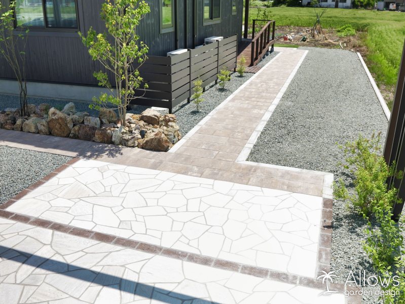 道路と反対側にある玄関まで、距離のあるアプローチには天然石風のインターロッキングを使用。