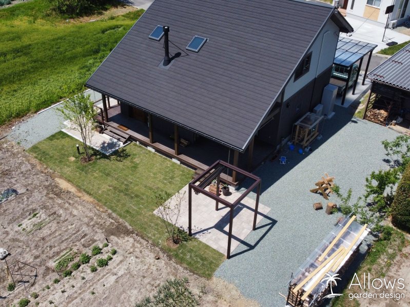 玄関ポーチからリビング前へと繋がる、広いウッドデッキからステップで降りられる場所に配置し、家と庭が一体となって過ごせる空間になっています!