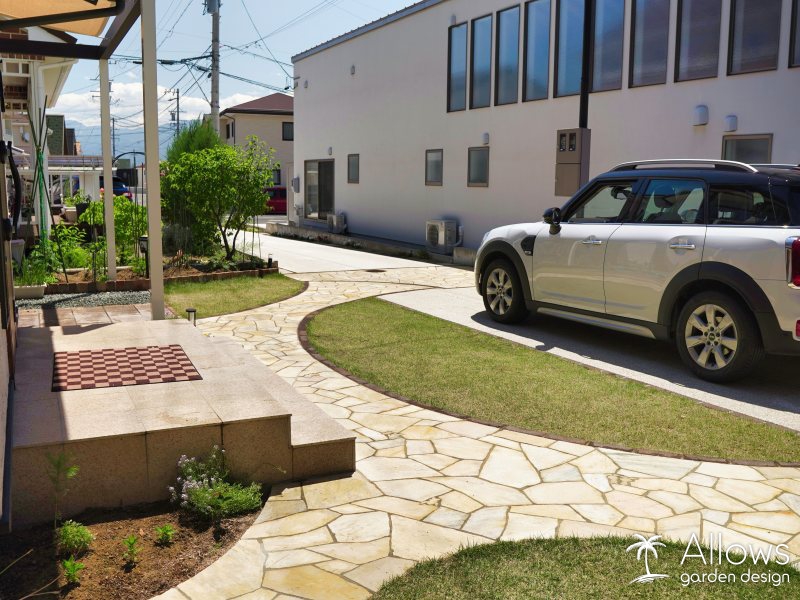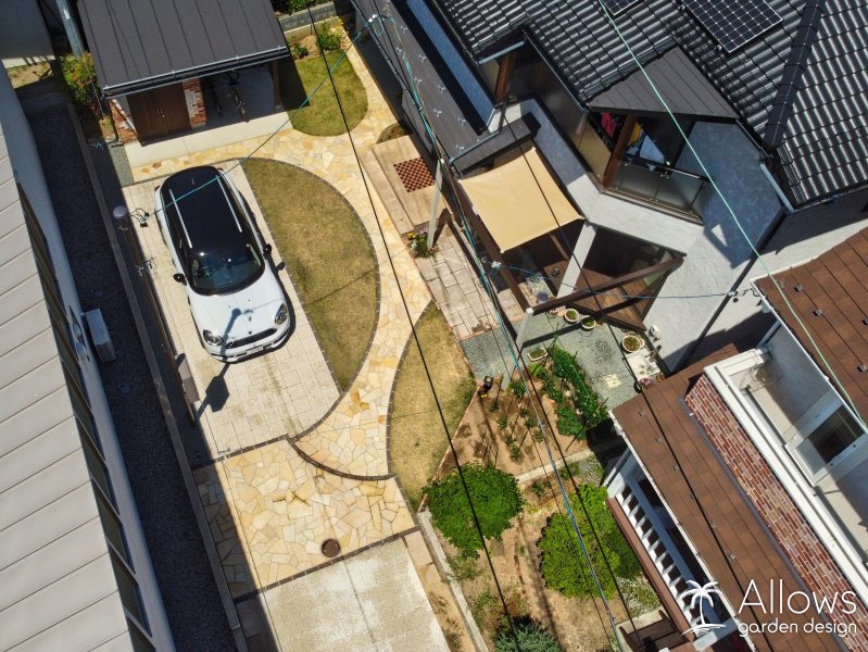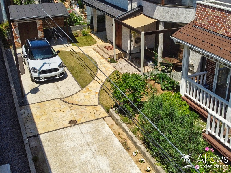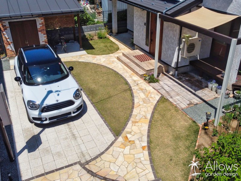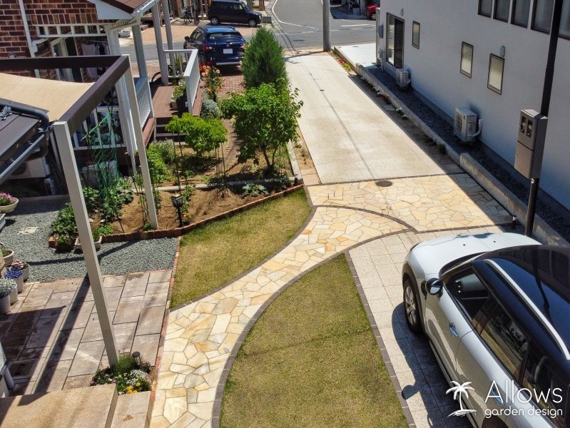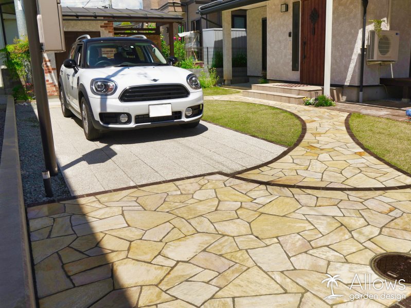 そんな住宅にマッチするように、天然石やレンガ、小粒の石を固めたインターロッキングなど、ファサードを形成する舗装材は天然素材でコーディネートしました。