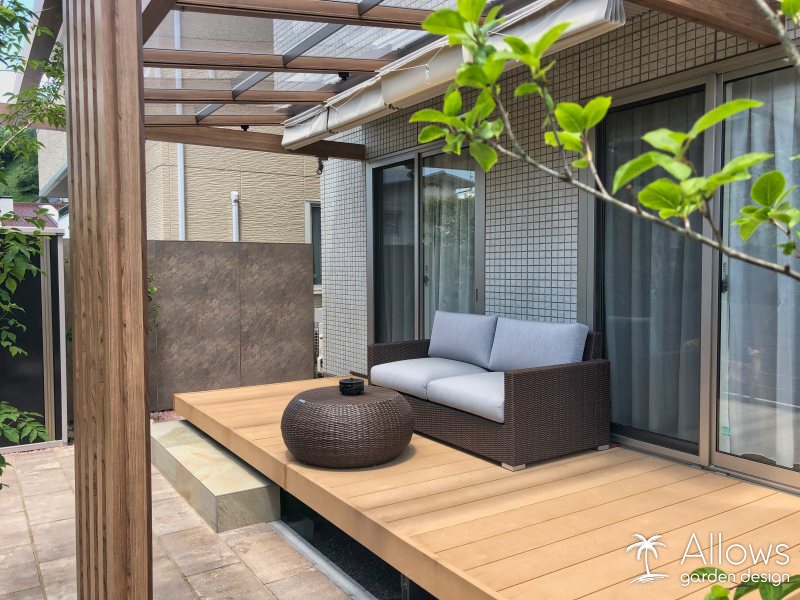 既存のウッドデッキの上に、開閉式日除け付きの屋根を新設。