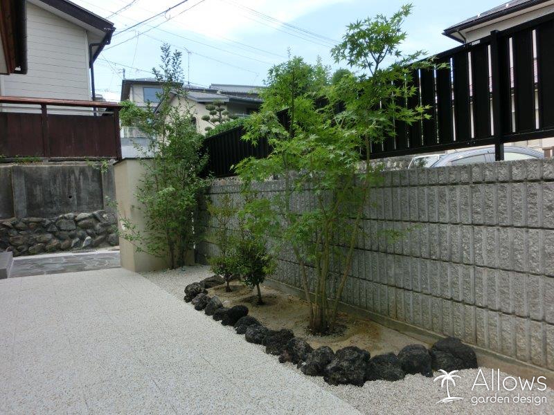 園路脇の花壇は浅間石で囲い、イロハモミジ・ドウダンツツジを植栽しました。