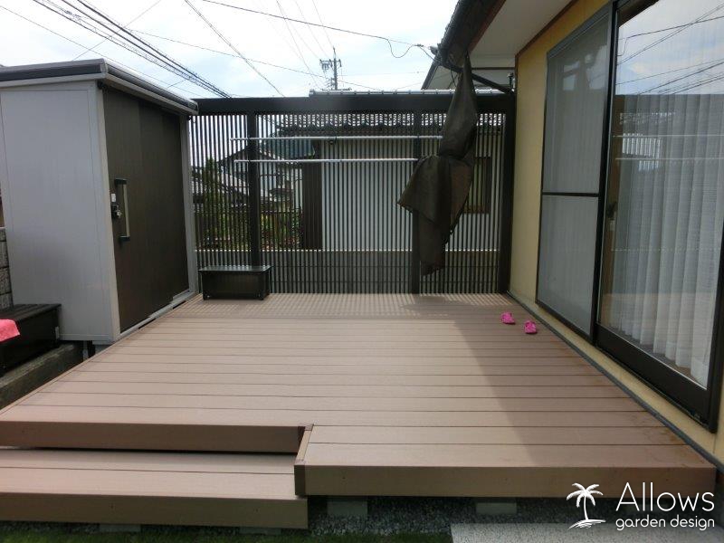 庭の奥には大きなウッドデッキ設置し、目隠しにはリクシルのプラスG(細縦格子スクリーン)を使用。