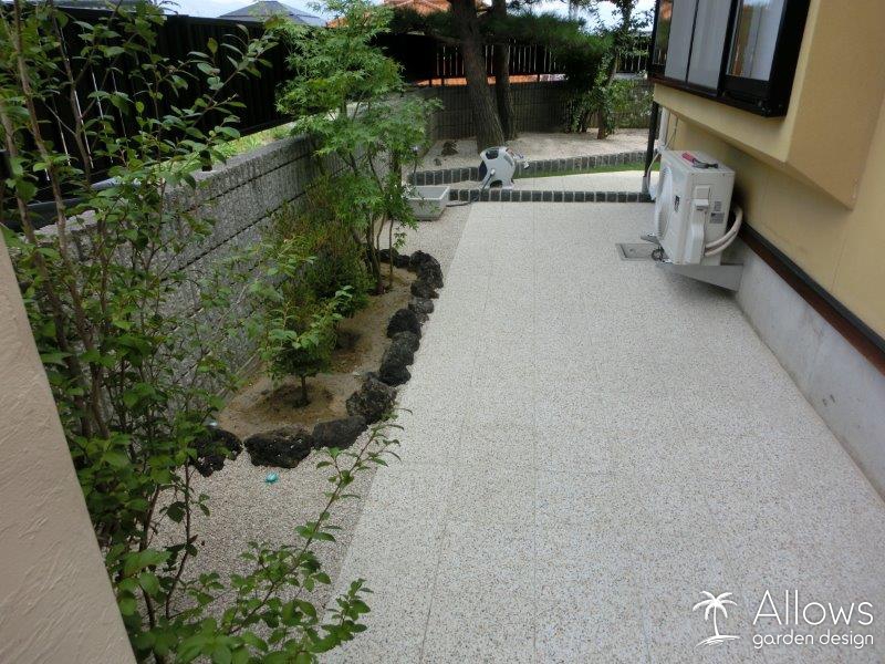 ガーデンには、黒のピンコロ石で高さを出した植栽スペースに。