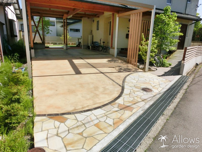 住宅の外観に合わせ、デザインフレーム・天然石の乱張り・カラーコンクリートなどの色調を同系色に。