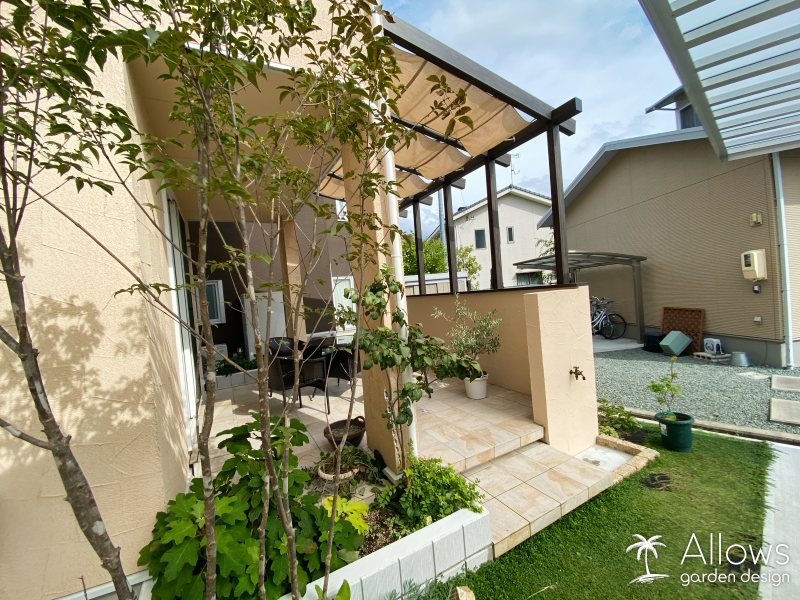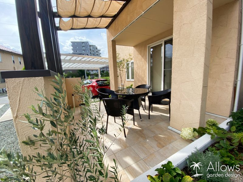 中はタイル張りで仕上げ、周辺にはしっかりと花壇スペースをとりました。