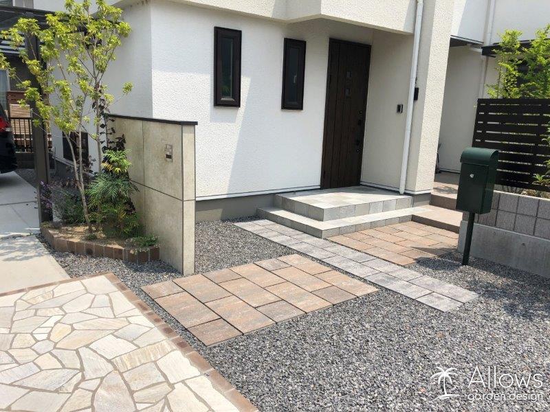 レンガや石目調のボード、天然石の乱張り、石畳調のインターロッキング・・・。