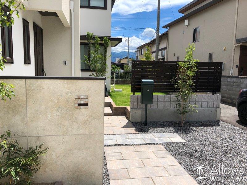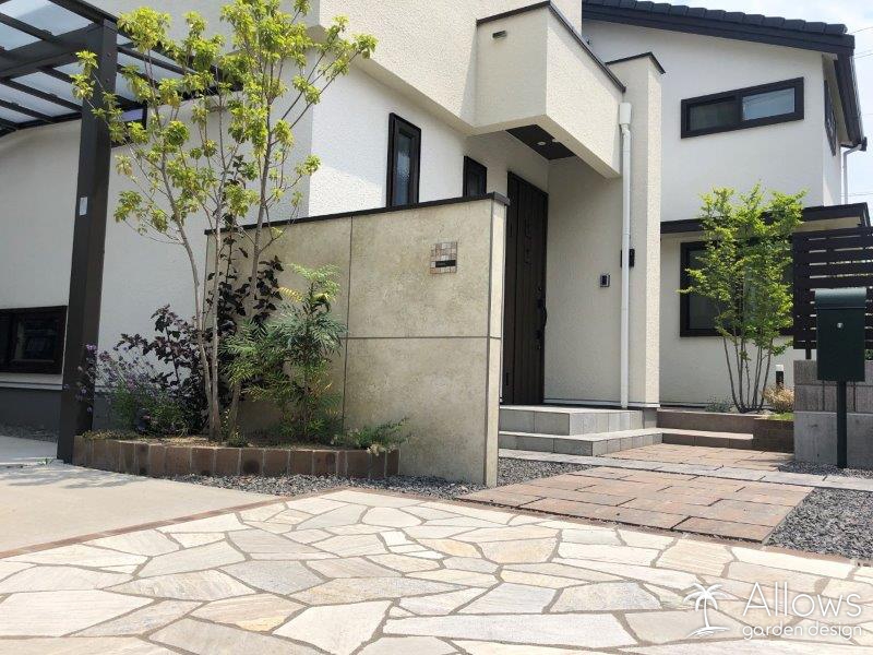柔らかい印象の住宅に調和させるように、アプローチや門袖には天然調のものを選択しました。