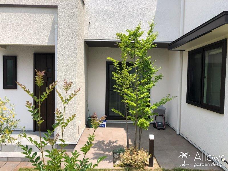 タイルテラス正面には、目隠しと日除けのシンボルツリー、アオハダ。