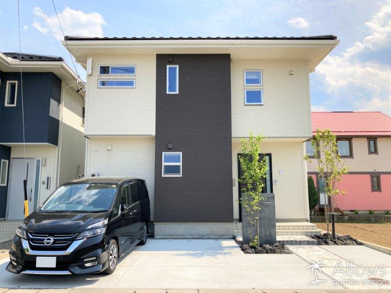 白黒ツートンだと冷たい印象になりがちですが、そこに植木や芝生の緑が入ることで、一気に柔らかい印象になります。
