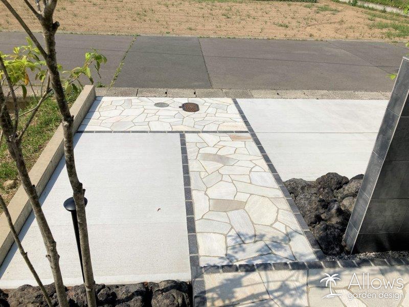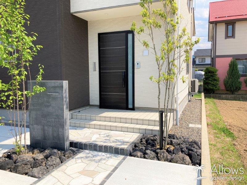 左右に植えた植木の足元に設置した浅間石も、空間をお洒落に演出してくれていますね!