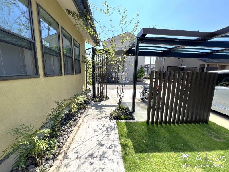 直線ではない遠路は、道路からの視線がガーデンへ抜けない効果もあります。