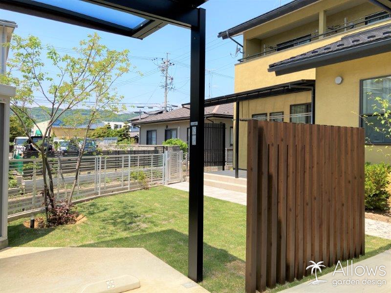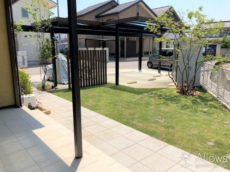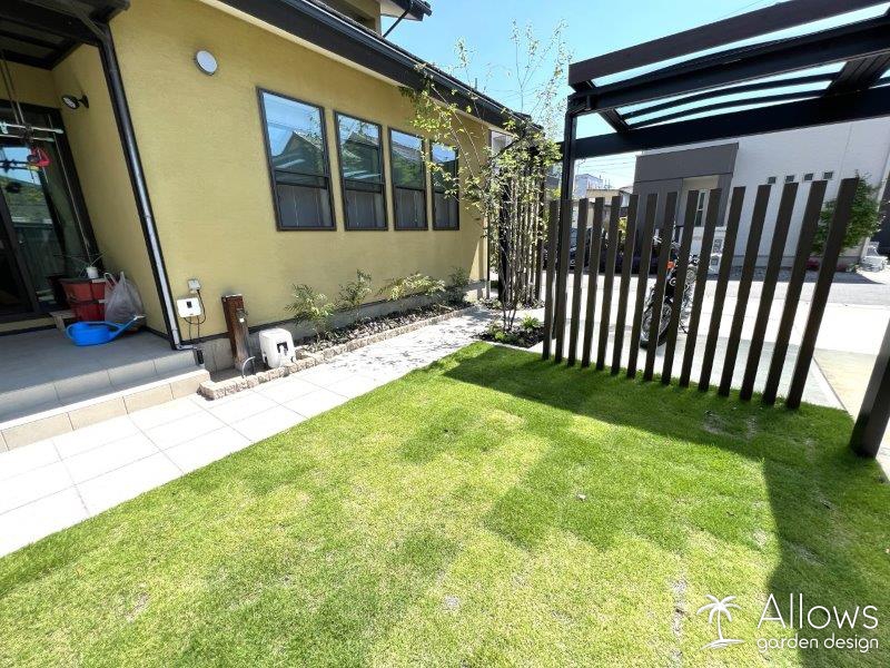 なるべく維持管理の手間が掛からないように、飛び石などのない、すっきりとした芝のガーデンになりました。