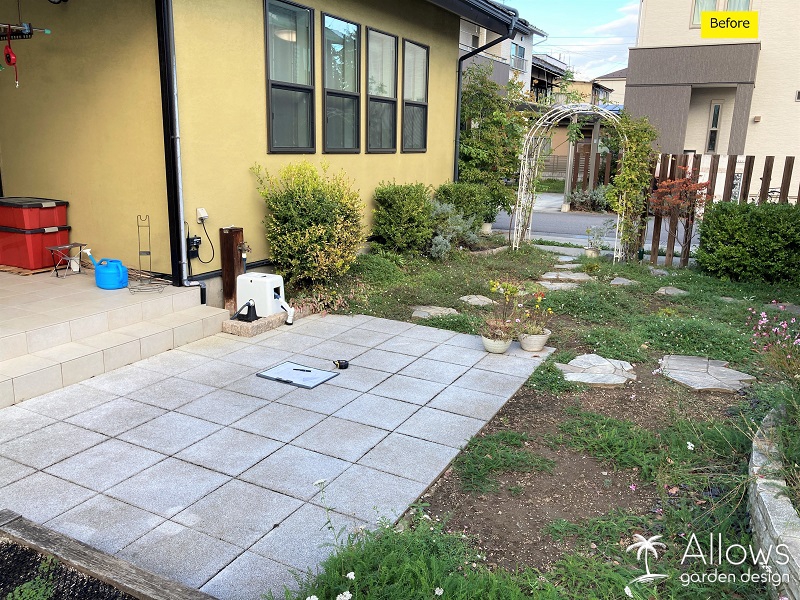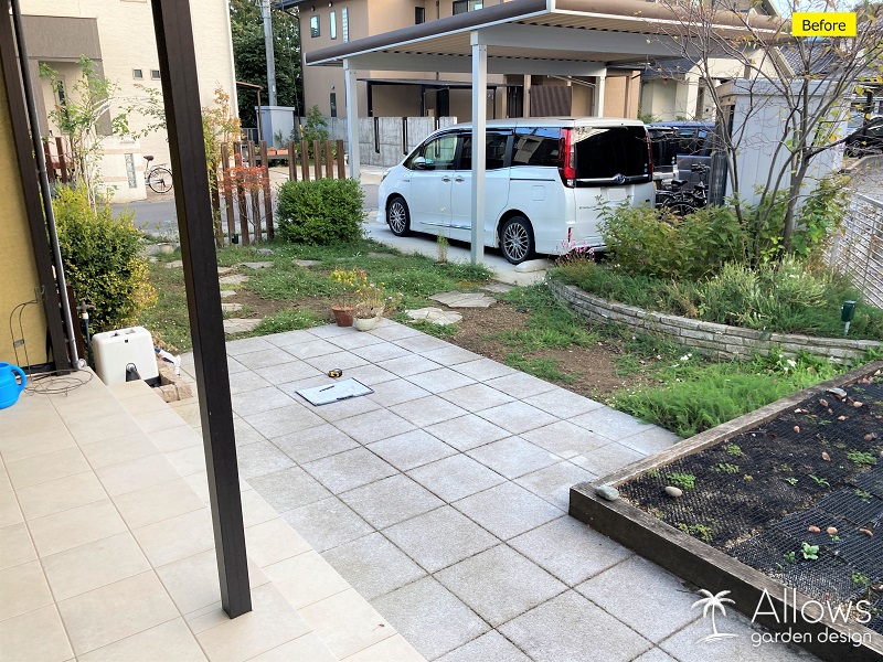 タイル張りとルーフのテラス空間は以前のままですが、ガーデン空間はリフォーム。