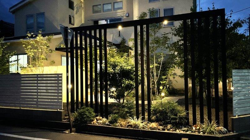 地面から植木に向けるアップライト、上空のフレームから小径を照らすダウンライト、周囲を照らすポールライトと、様々な方向を向けています。