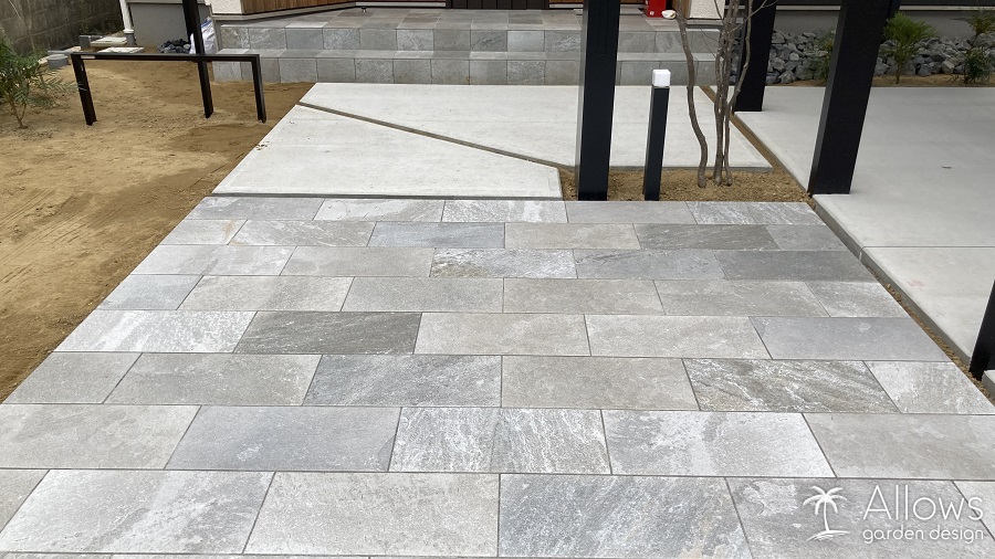 玄関ポーチと同じタイルのサイズ違いを使用する事で統一感とアプローチの広がりを演出。