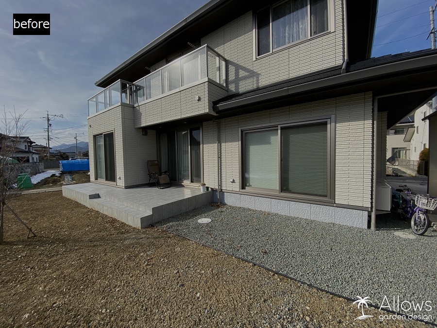 タイルテラスはあるものの、周りは土の状態で目隠しもなく、過ごせる庭ではありませんでした…