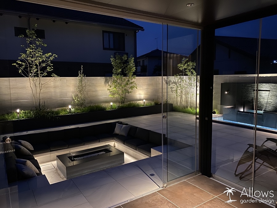 ガーデンの中央には周囲より数段掘り下げたシッティングスペース。