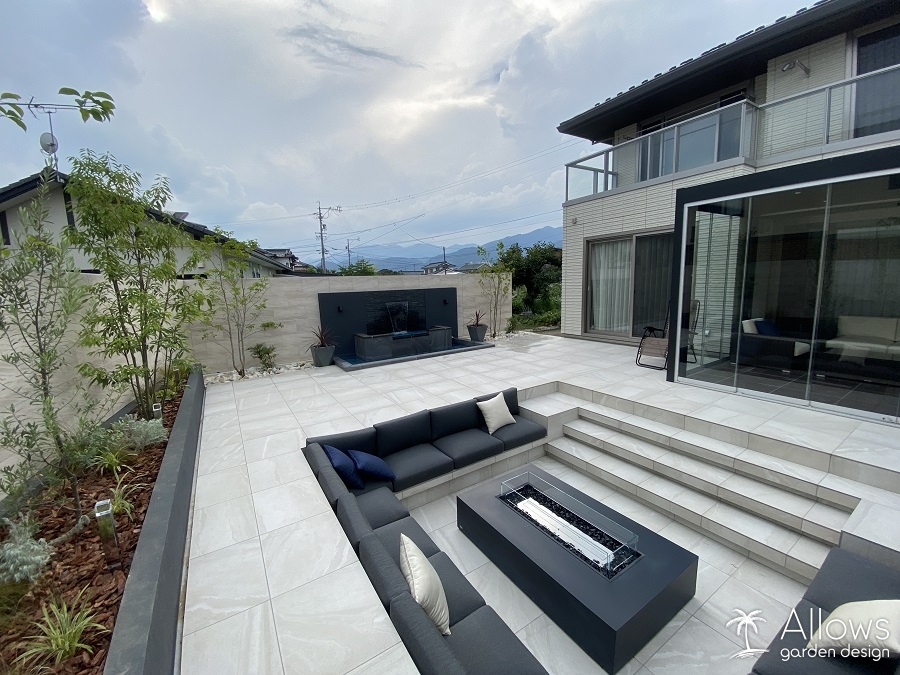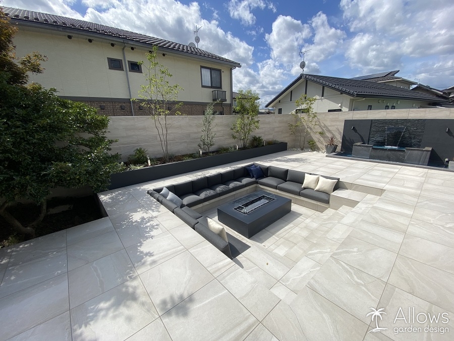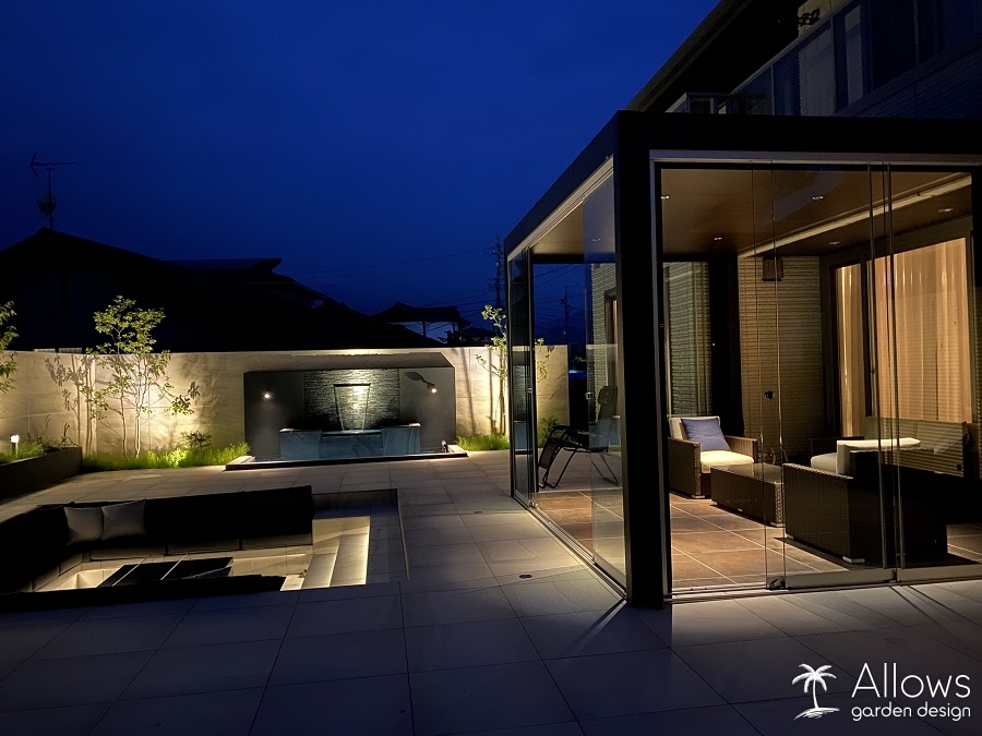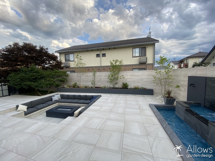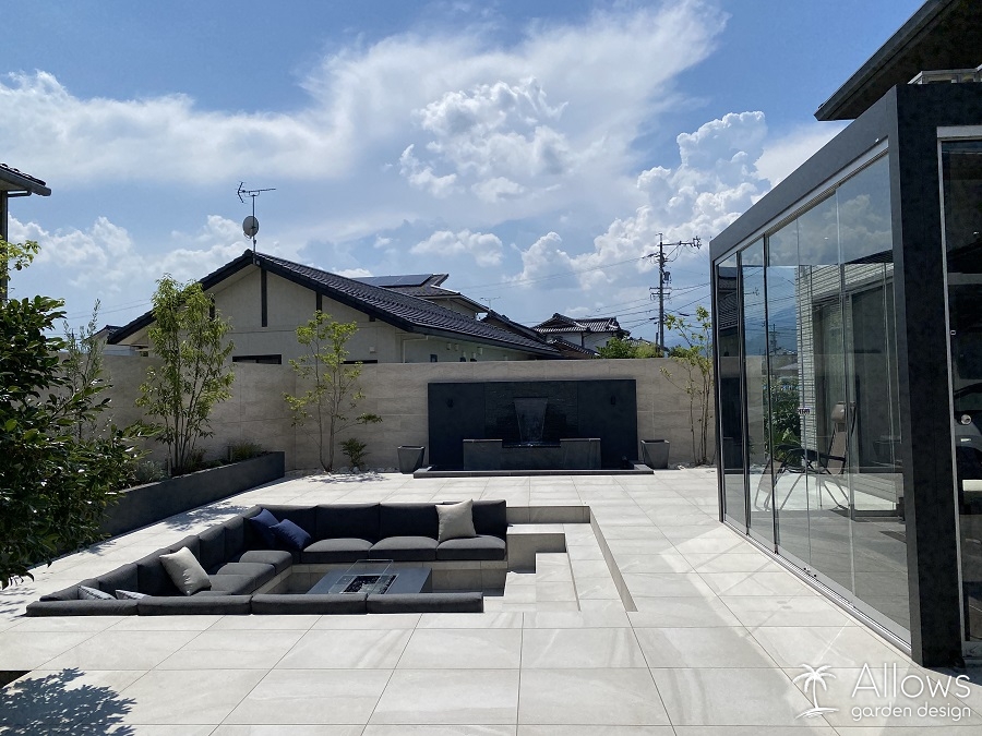 そこで!! 広いタイルに、おしゃれな目隠し、全面ガラス張りのオールグラスポーチに、壁泉、リゾートガーデンに大胆リノベーション!