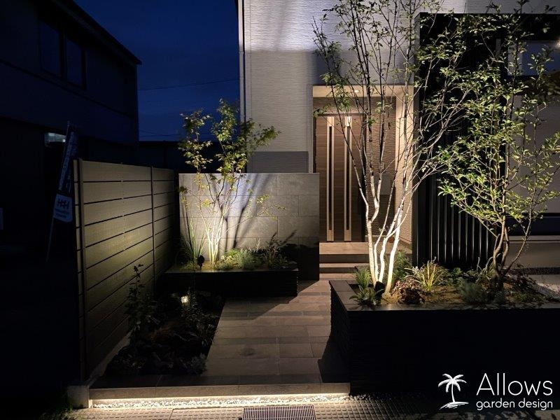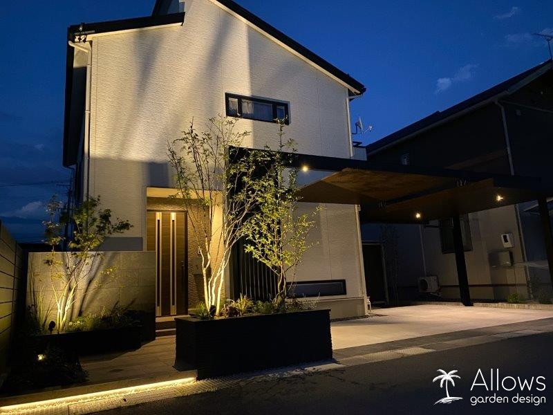 カーポートや植栽だけでなく、ステップ下にも間接照明を入れ浮遊感を演出しています。