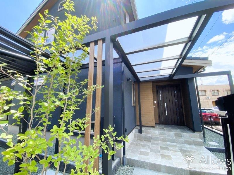 車から玄関まで雨の日でも濡れずに行き来できるようにしたい、というご希望からカーポートと玄関までのルーフを設置。
