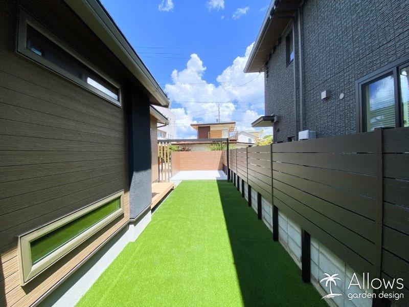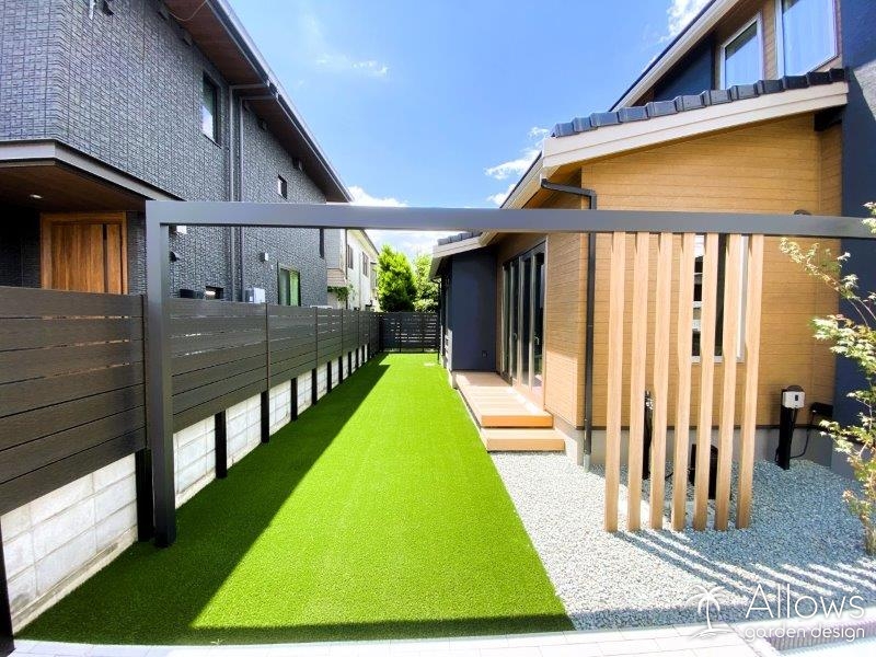ガーデンの床はインターロッキングと人工芝になっており、ローメンテナンス空間を実現しています。