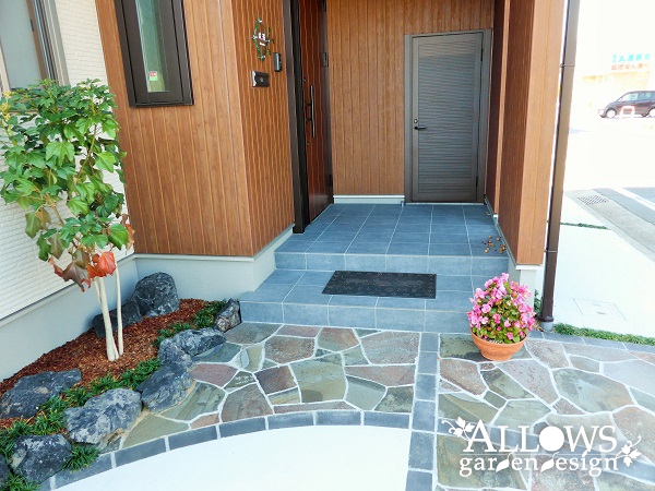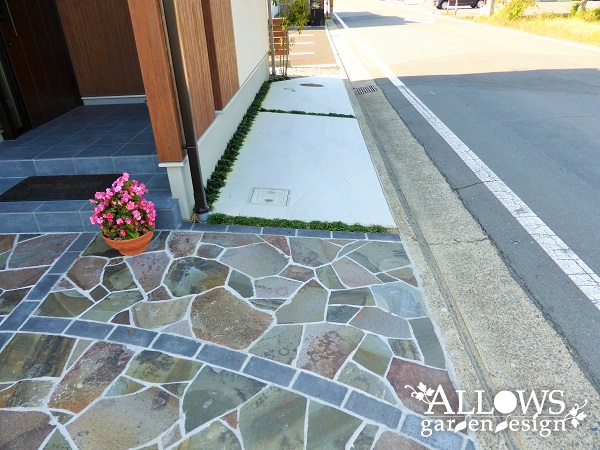 アプローチは鉄平石を使用した乱張りで仕上げました。