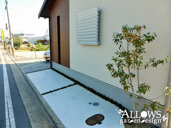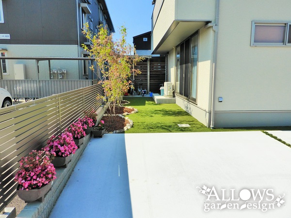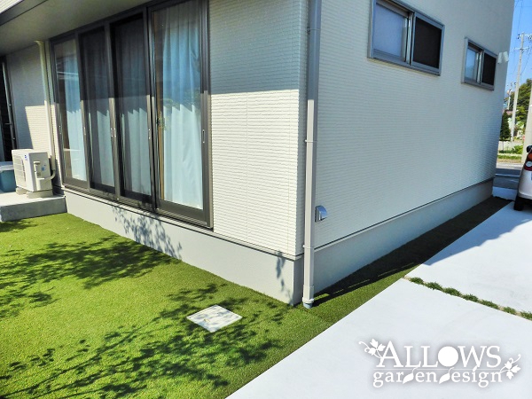 駐車場コンクリートと家にわずかな隙間を設けて、こちらにも人工芝。