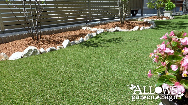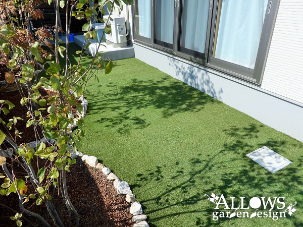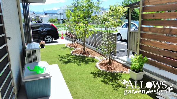 メインをローメンテナンスな人工芝で仕上げ、高木を3本植え付け。
