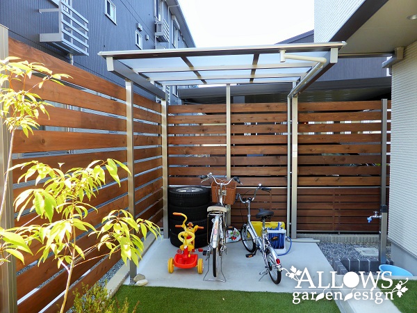 サイクルポートは既製品のアルミ製ですが、天然木の板で囲って