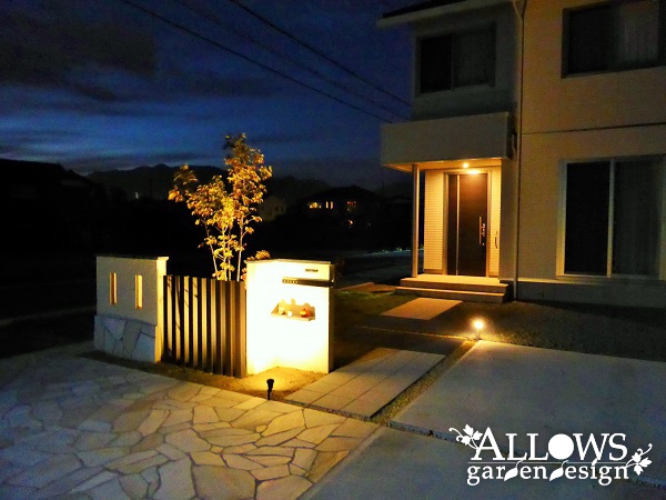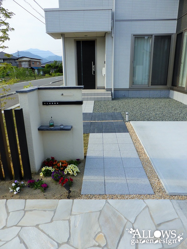 一番人目に触れる角の部分には乱張りの天然石、アプローチはインターロッキングを採用。