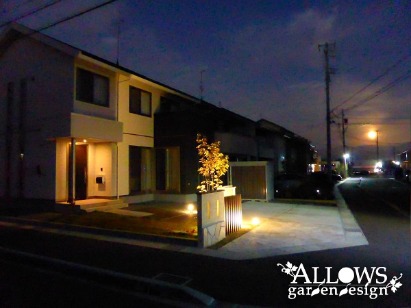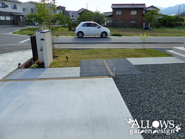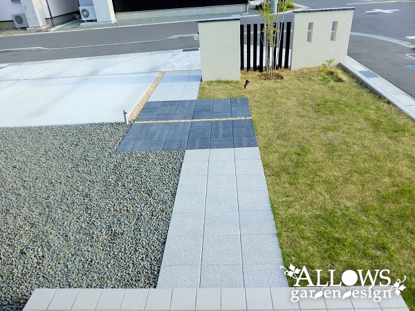 アプローチのインターロッキングは、住宅のカラーと合わせて2色使いで変化を。