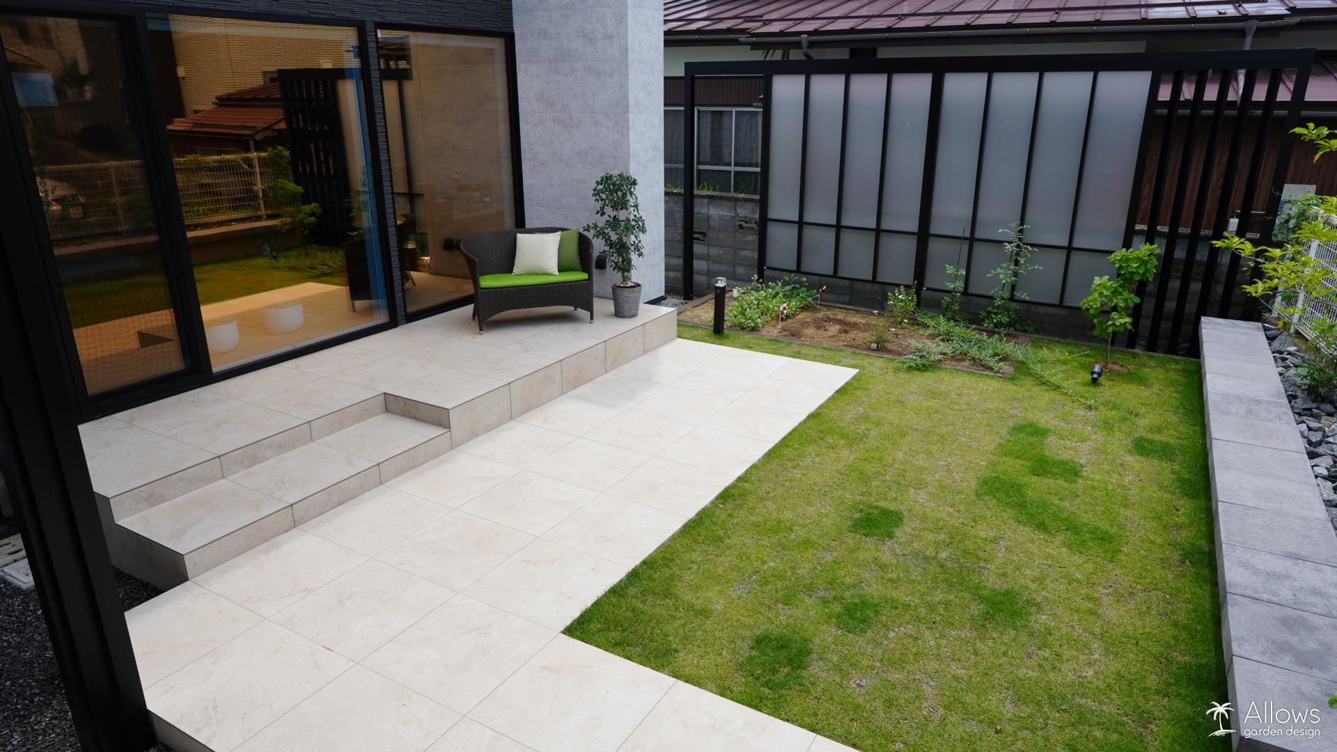 広々とした、タイルテラスと天然芝のガーデン。
